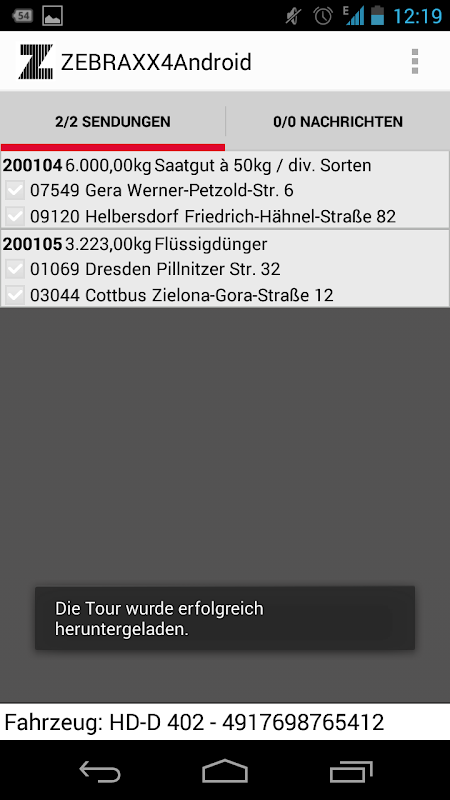 En la versión de lujo, las direcciones de carga y descarga completas se cargan en el Android smartphone Su conductor en el respectivo Ausliefertag. Esto se puede detectar la información de estado acerca de cada programa que resulta más cómodo y rápido. La detección de estado es más eficiente y, gracias a UMTS / LTE también más rentable posible. Los mensajes de estado se transmiten a través de UMTS / LTE en tiempo real en el servidor ZEBRAXX y están disponibles para todos los involucrados en el proceso de forma rápida y fácilmente disponibles.