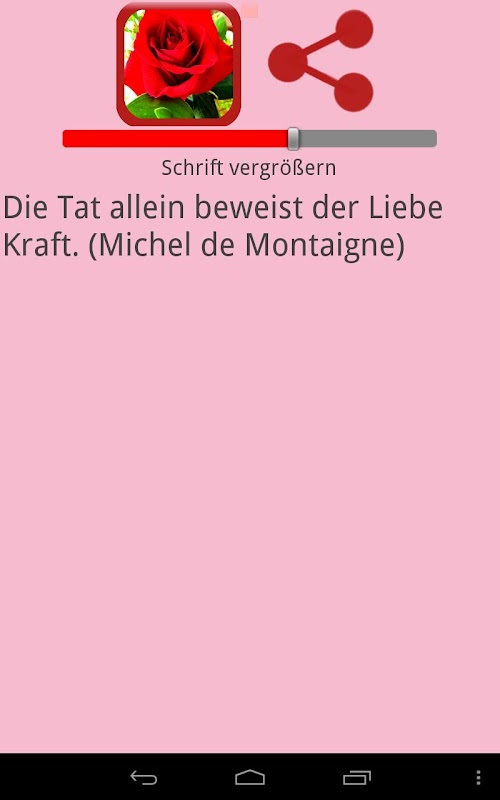 Die Liebe zwischen zwei Menschen ist das stärkste Gefühl, dass es im Leben gibt. Liebe ist ewig, Liebe kennt keine Grenzen. In dieser App haben wir für Sie 50 wunderschöne Zitate zur Liebe zusammengestellt. Die Schrift der Zitate ist auf Wunsch vergrößerbar. Wir wünschen Ihnen und Ihrer großen Liebe viel Freude daran.