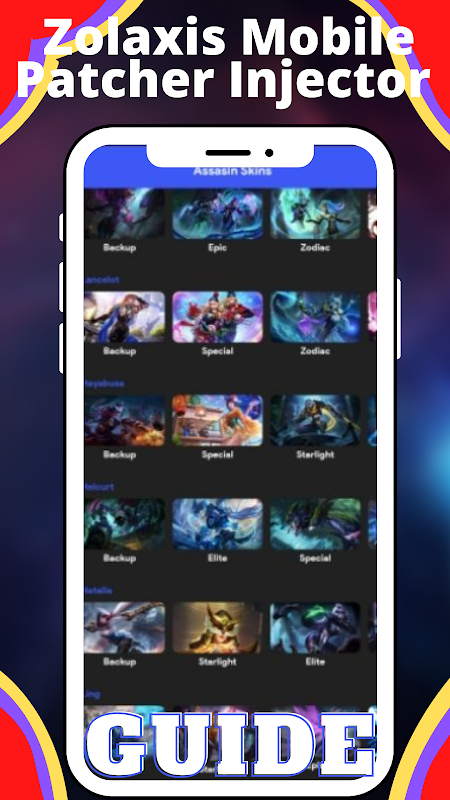 Zolaxis Mobile Patcher Injector Unlock Skins Guide App is an app made to let your read all the legend heroes skins and abilities including spells skills passive attacks and special powers and each heroes skins visual appearance of the abilities including all the kinds of heroes.