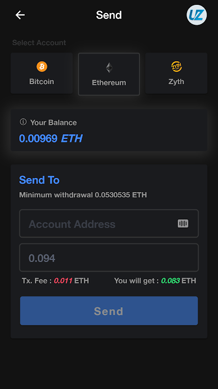 El usuario individual puede enviar o recibir btc, eth y zyth desde la aplicación.