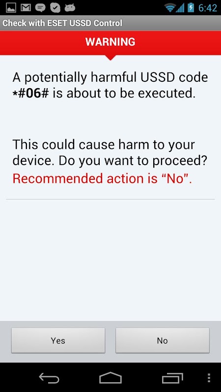 By checking for malicious codes before they are executed, ESET USSD Control makes sure that all data on your Android phone stay safe. The app displays a warning window each time a malicious USSD code is found, blocking the execution of the potentially harmful command.