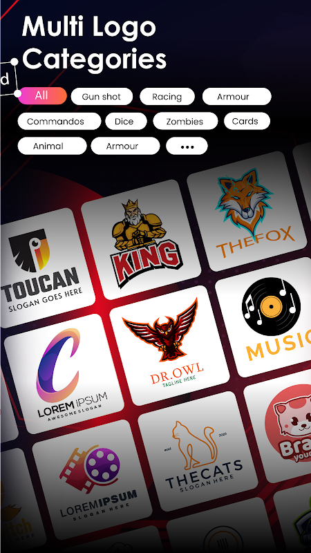 Logo creator and the designer free app also have multiple creative designs for many esports categories, you can pick up a relevant design and edit it according to your need, and simply after the completion of the logo share the file with people through any social app.