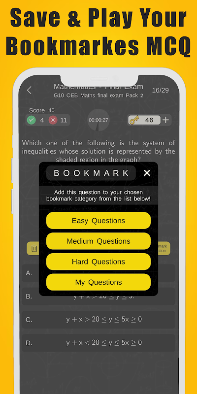 🔖 Bookmarks – save questions and revisit them later by category (Easy, Medium, Hard, Mine).