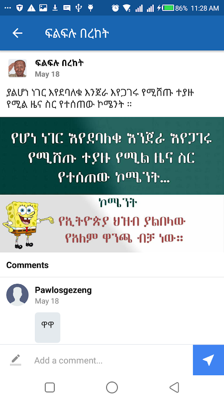 Ethiopian Comedy apps will share to you some funny pictures, texts, videos and Ethiopian comedian jokes like Filfilu, Kibebawe Geda, Aseres Bekele, Lij Yared, Demssie WanosTesfaye Kassa and other Ethiopian comedian jokes.