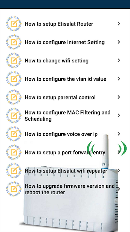 In our mobile app, we explain how to configure the Etisalat router. It provides information on many issues such as router setup and settings, etisalat password change and wifi repeater setup.
