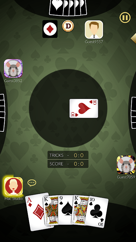 Play Euchre card game where you've to reach 11 points or 10 points to win based on the selected variation. Game offers three variations: