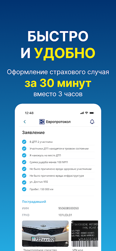 Europrotocol is a mobile application developed for convenient and fast online registration of road accidents without the involvement of the police and an insurance agent. The application simplifies the process of registering an insured event and makes it accessible to all citizens of the Republic of Kazakhstan and non-residents.