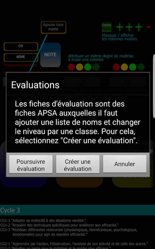 The application provides optional, calculation notes related to the Masters degree profile (Not = 1pt acquired, being acquired = 2.5 pts, acquired and mastered = 4pts = 5pts): By default, these values are modeled on those of the current LSU (10-25 - 40 and 50pts) but remain editable when creating APSA sheets.