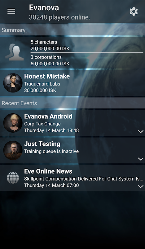 Evanova is the most complete Android application for managing your Eve Online characters, corporations, fittings or other Eve Online information.