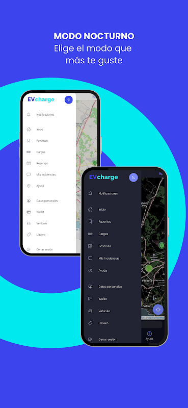 - Map: indicates the user's position and that of the chargers.