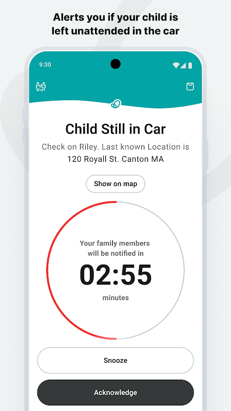 4. CHILD STILL IN CAR alerts the caretaker if their child has been left buckled inside the vehicle when the caretaker and their mobile phone have moved away from the clip. It will also alert family members with the last known location of the vehicle if the primary caregiver does not respond to the alert.