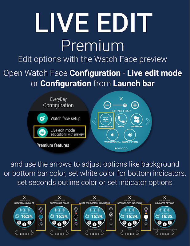 ★ Ability to set background or bottom bar color, set white or black color for bottom indicators, set seconds outline color or set indicator options using the Live Edit feature using the Watch Face preview
