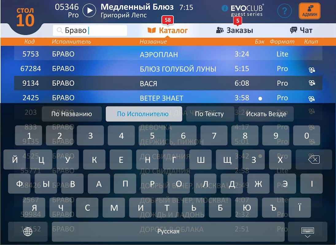 «EvoClub» - electronic catalogs karaoke songs with sending the order sound engineer