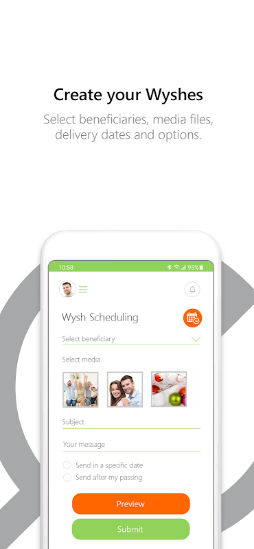 ewysh is an application that enables subscribers to create, manage and save uniquely created content then share it with identified personnel and/or loved ones at defined date(s) or after subscribers are no longer able to communicate. Wyshes can be in the form of voice, media, or other format you deemed fits recipients.