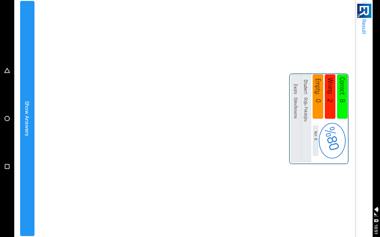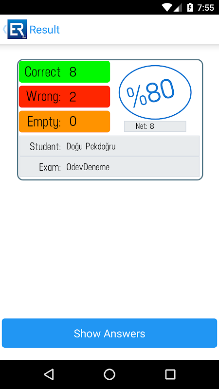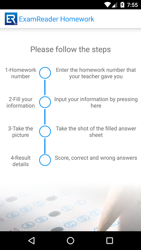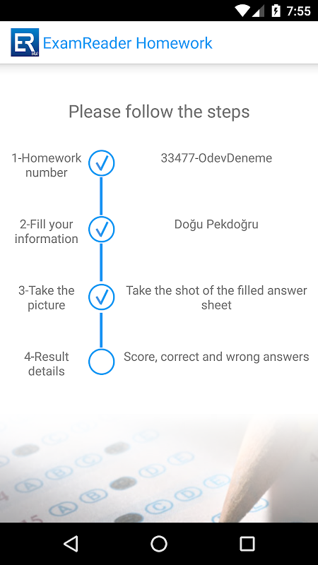 Teachers can create homework using Exam Reader Cloud. Students or their parents can grade them using their device's camera optically and see the results instantly. The results are also sent to teacher automatically so that they can use them in their reports. Grading is done only by inputting the homework number, and student number. For simplicity, the program uses device's own camera software.