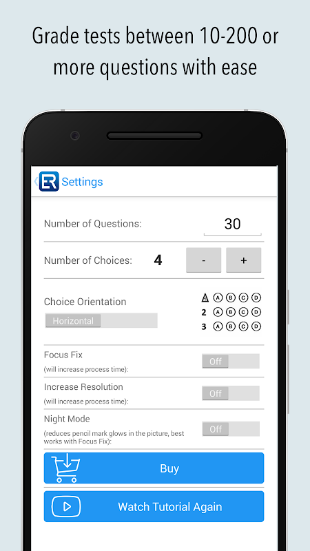 Grade multiple choice tests, quizzes, and assessment papers by using your phone's or tablet's camera as a grading scanner. It can also read over-written marks.