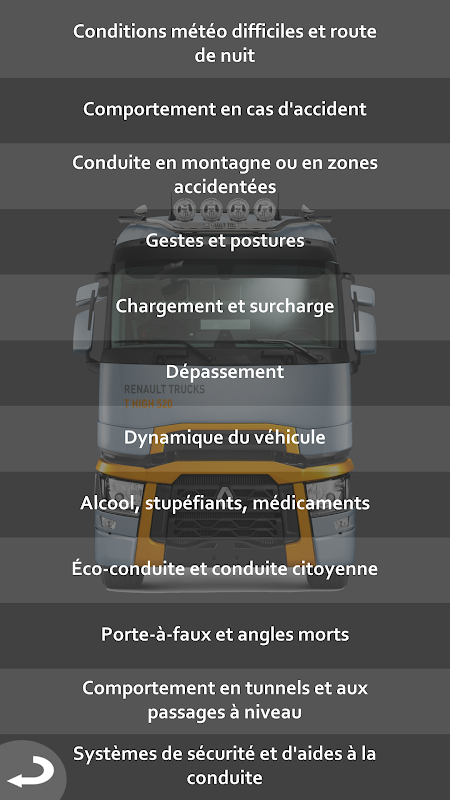 Regular updates are made to adapt to the evolution of the state program. The application covers the entire program of oral and written tests of the heavyweight plateau of the C, CE, D, DE, C1, C1E, D1 and D1E licenses.