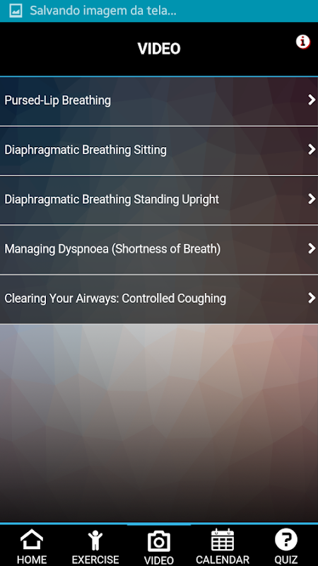 The Exercise Respiratory app teaches the user simple, safe and adequate exercises to deal with Asthma and COPD, using interactive tools such as images, videos, calendar with exercise register functionality to keep track on symptoms and exercise frequency and type of activity. The user can then export it to show it to the doctor. Besides, the user can test its knowledge regarding Asthma and COPD in an amusing way through a little and fun quiz.