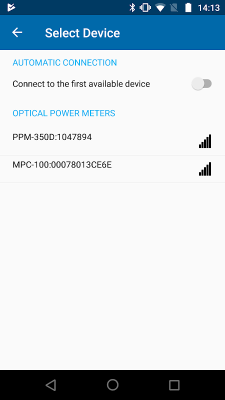 The EXFO OPM [Optical Power Meter] application can connect over Bluetooth™ to both EXFO’s PON Power meters (PPM-350D), and power checkers (MPC-100 series). When connected, the app can display live measurements and store measurements, along with the following advanced/additional features: