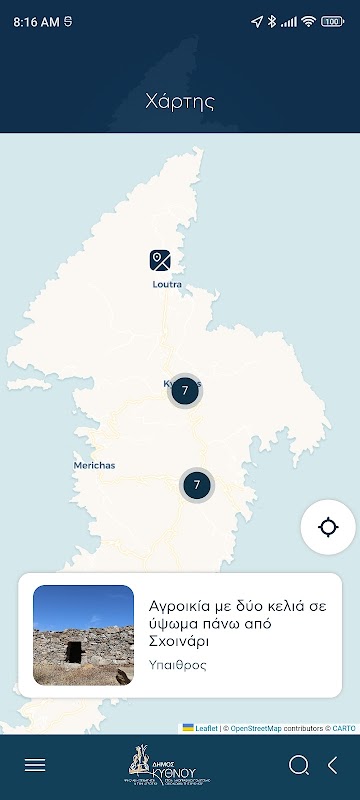 The application allows interactive digital tour through the utilization of modern tools of augmented reality, audio tour and modeling of selected points of interest of Kythnos.