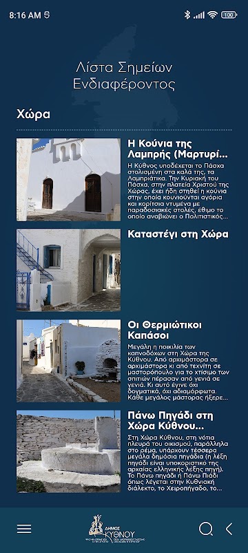 As part of the implementation of the project, a Mobile Application was developed, which includes the digital tour guide of the Folklore Culture and the Agricultural Economy of Kythnos in three languages (Greek, English, French).