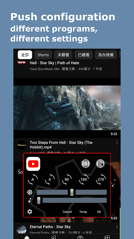 According to the user's usual habits, different parameters for "screen brightness/volume/rotation/keep screen on" are set for different applications (APPs) to eliminate the hassle of adjusting them every time.