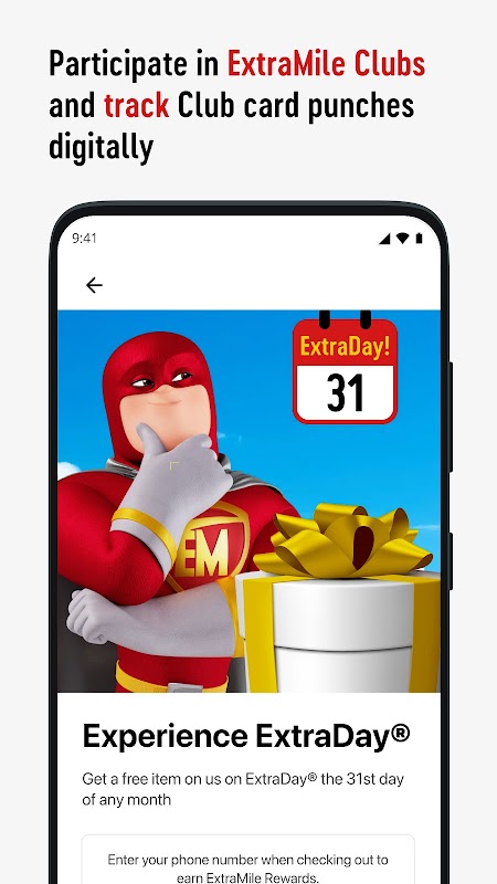 ∙ Participate in the Mile One Coffee® Club, 1L Water Club, Fountain Club, and Hot Food Club. Track your Digital Card Punches on the ExtraMile Rewards app by entering your account phone number at a participating location to get these offers.