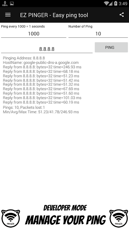 -Developer mode you can manage your ping, how much time you want pinging, and how long you want ping your website, this mode you will easily see min/average/max on your ping network.