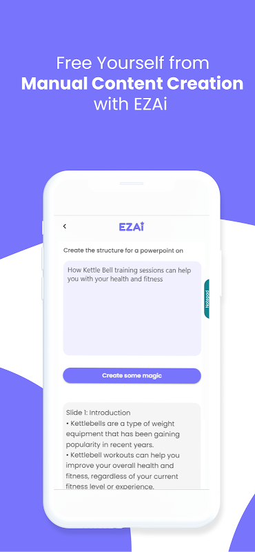 Introducing EZAi - the ultimate AI-powered content generator that will revolutionize the way you create content from your mobile device. With EZAi, you can create engaging, high-quality content for any purpose in minutes.