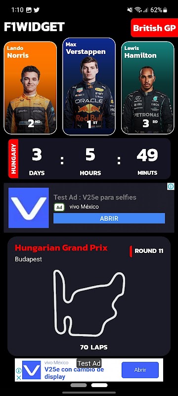 The F1 widget app comes with an awesome and unique way to follow your favorite driver and the next race information. Make your home screen stand out with excellent cards whit a driver. Each driver has his own card and every card contains info from the current round of F1.