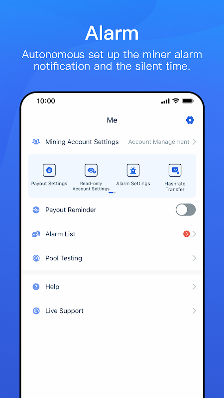 The f2pool app offers a simple way for everyone to manage their mining operation. Conveniently manage your mining machines, view your revenue, and even utilize our one-click button to switch between logged-in and anonymous mining. Miners can access every function of the website through the app, including the ability to set up custom alerts for any worker or group.