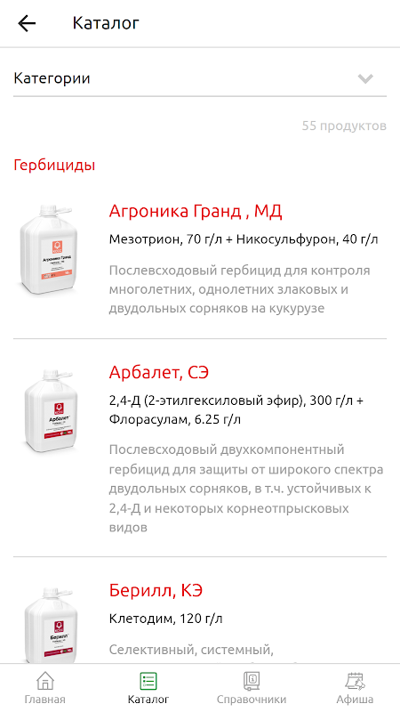 بخش کاتالوگ شامل عکس ها و اطلاعات دقیق در مورد بیش از 50 داروی تولیدی خودمان است. محصولات را میتوان بر اساس دستههای کاربردی فیلتر کرد: علفکشها، قارچکشها، حشرهکشها، تیمارهای بذر، خشککنندهها، سورفکتانتها و کودهای معدنی.
