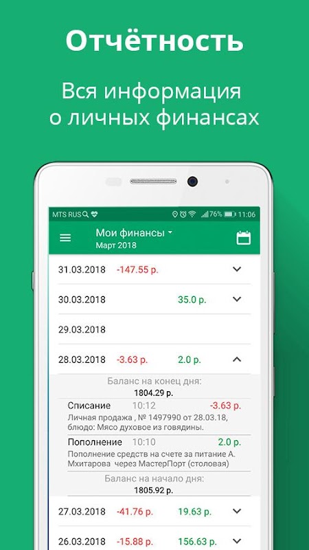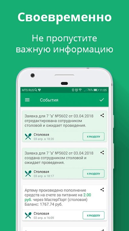 "کانتین" - کارمندان م institutionsسسات آموزشی می توانند برنامه هایی را برای یک کلاس برای وعده های غذایی جمعی (وعده های غذایی پیچیده ، وعده های غذایی برای پوشش) ایجاد کنند. کارمندان می توانند با استفاده از یک برنامه تلفن همراه ، مشابه کیوسک های سلف سرویس خریدهایی را انجام دهند و محصولات را در محل تحویل در بوفه مدرسه دریافت کنند. آنها همچنین می توانند اطلاعات مربوط به سفره خانه مدرسه و غذاخوری مدرسه را مشاهده کنند: منو ، تاریخچه سفارشات ، کنترل موجودی وجوه حساب خود.