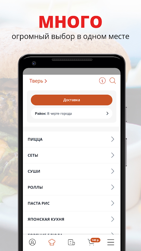 انتخاب بزرگ پیتزا؛ غذاهای ژاپنی: سوشی، رول، ست، رشته فرنگی و برنج؛ برگر و شاورما، غذاهای گرم، تنقلات و دسرها.