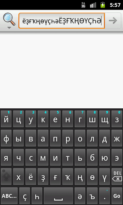 صفحه کلید باشقیر پشتیبانی از سه زبان: باشقیر، انگلیسی و روسی.
