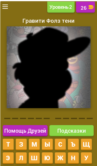 Игра для фанатов мульта Гравити Фолз. Попробуйте разгадать всех персонажей! Это не скучная викторина в которой тебе нужно будет угадывать персонажей из любимого мультсериала. Если ты вдруг не можешь угадать, то тебе на помощь придет подсказка!