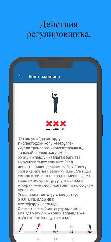 برنامه تلفن همراه به آماده شدن برای امتحان در یک آموزشگاه رانندگی کمک می کند و به یادگیری علائم جاده کمک می کند. مزایای اصلی این پلت فرم دسترسی و کامل بودن اطلاعات ارائه شده به سه زبان (قرقیزی، روسی، انگلیسی) است. ساختار اپلیکیشن مطابق با درخواست کاربران طراحی شده و به یافتن سریع اطلاعات لازم کمک می کند.