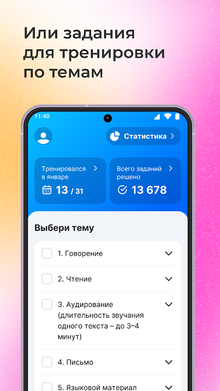 با "انگلیسی آزمون یکپارچه دولتی" مطالعه کنید و در امتحانات به نتایج بالایی برسید! همین حالا برنامه را دانلود کنید و به شما اجازه می دهد برای آزمون یکپارچه دولتی 2025 آمادگی خوبی داشته باشید. گرامر، واژگان و لیسنینگ را تمرین کنید، برای بخش شفاهی و کتبی امتحان آماده شوید.