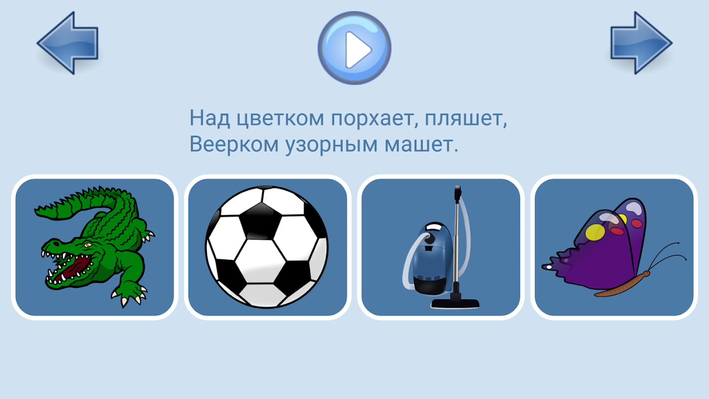 Текст загадок озвучивается, а варианты ответов представлены в виде картинок, что позволяет ребенку заниматься самостоятельно.