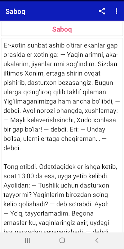 Yohud O'qing faqat Yig'lamang. Chunki ushbu dasturni yaratishim davomida undagi hikoyalarni o'qir ekanman ko'zlarimga yosh keldi. Qancha harakat qilmay Ularni to'xtata olmadim. (albatta ota-ona xaqidagi hikoyalar o'qigan paytimda).