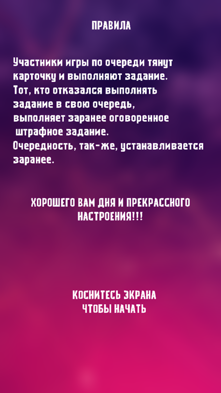 Фанты- это игра для вечеринки или просто для веселой компании друзей. Позволит отлично провести время играя с друзьями. Огромное количество неприличных вопросов и веселых заданий обязательно поднимет настроение вам и вашим друзьям. Мы гарантируем прекрасное настроение и бурю ярких впечатлений от использования нашего приложения.