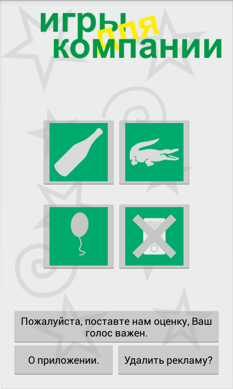 Этот сборник- просто бомба вечеринок. Прекрасное время провождение с друзьями. Лучший сборник для компании. Представляет из себя 3 игры со смартфоном или планшетом: Бутылочка, Крокодил, Фанты. И несколько игр в которые можно играть без смартфона или планшета. Давайте веселиться вместе, вместе с играми для компании.