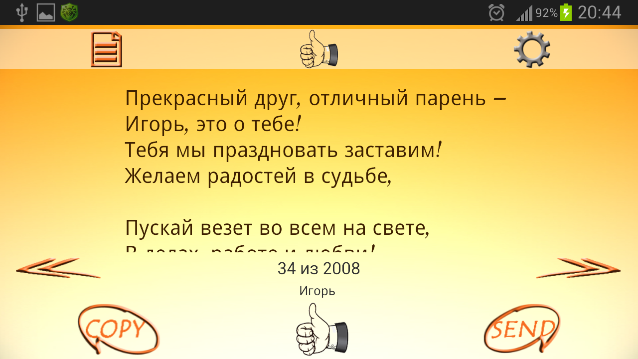 Понравившееся поздравление можно добавить в избранное, скопировать в буфер, послать на смс, вконтакте, одноклассники и т.д. (любое установленное на телефоне приложение, которое принимает текст)