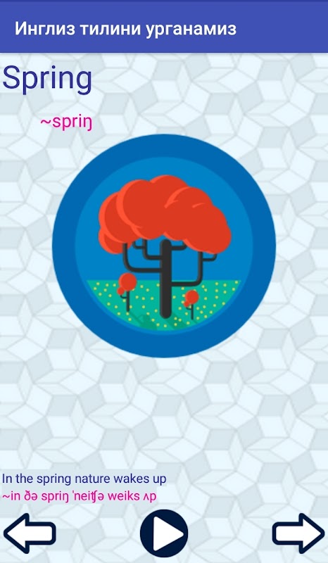 Bu dastur orkali siz ingliz tili harflari، sonlari، ranglar، oylar، shaklar wa boshkalarni urganishingiz mumkin. هار بیر هارف و سوز اوچون آلوهیدا تووش یوزیلگان.