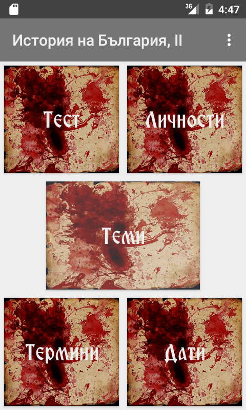 - "Теми" (наличен в платената версия на приложението (https://play.google.com/store/apps/details?id=com.goodlab.bgrenpaid) ще откриете българската история, разбита на 27 подтеми (първите години на развитие в рамките на Османската империя до освободителната Руско-Турска война).