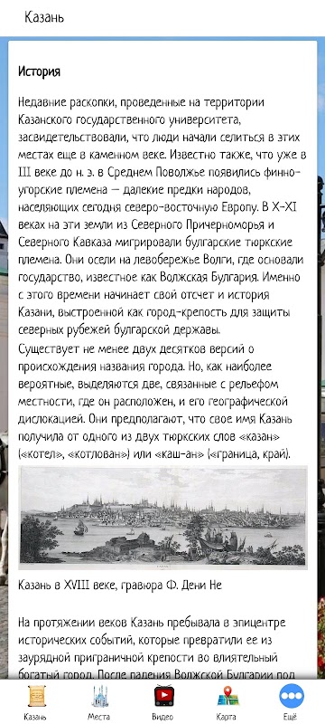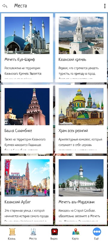 در این اپلیکیشن می توانید با آشنایی اولیه با شهر کازان، با نگاهی به دیدنی ها و بررسی های ویدئویی، مکانی را برای سفر انتخاب کنید. با تاریخ شهر کازان آشنا شوید. همچنین در برنامه اطلاعاتی در مورد آژانس های تور و هتل هایی وجود دارد که خدمات خود را در شهر انتخاب شده ارائه می دهند.