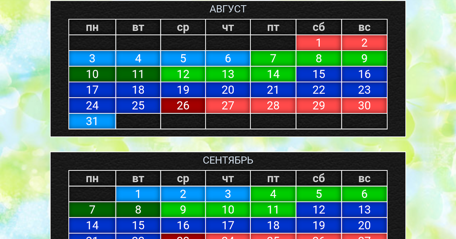 Узнайте ваши дни овуляции, менструации, благоприятные для зачатия дни и безопасные дни для занятия сексом. Женский календарь зачатия и овуляции простое в использовании приложение, служит для расчета менструального цикла и наиболее подходящего периода зачатия ребенка. Укажите дату последней менструации и ее продолжительность и общую длительность цикла. В календаре овуляции будут отмечены фертильные дни, в них вероятность зачатия достаточно высока, а также дни овуляции, когда вероятность зачатия максимальна. Задача женского календаря помогать женщине определить дни повышенной фертильности (овуляции), в эти дни зачатие ребенка наиболее вероятно. А благодаря расчету так называемых безопасных дней для секса, календарь овуляции позволит избежать нежелательной беременности, при этом не используя медикаментозные и механические противозачаточных средства.
