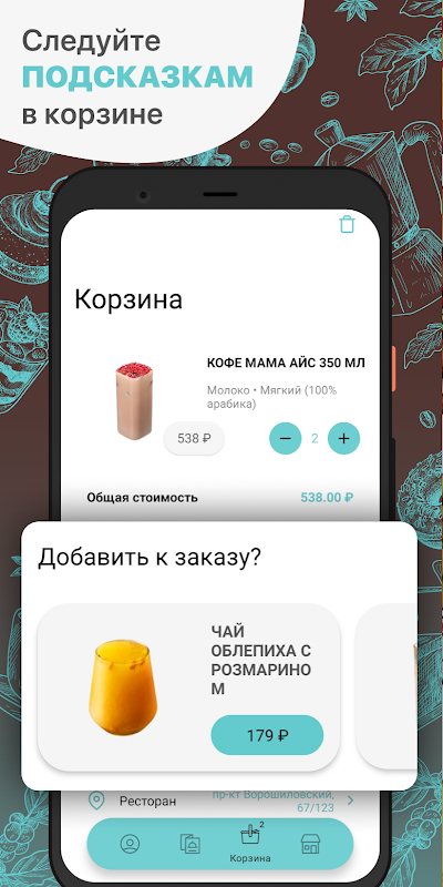 نحوه ثبت سفارش در برنامه "COFFEE MAMA": مواردی را که دوست دارید از منو انتخاب کنید، آنها را به سبد اضافه کنید و به صفحه پرداخت بروید (با کلیک بر روی نماد سبد).