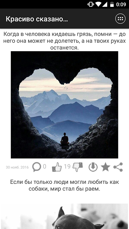 Понравившиеся записи можно комментировать и оценивать. Все понравившиеся картинки можно сохранять в галерее устройства в папке приложения. Ты можешь делиться записями с друзьями через социальные сети Facebook, Вконтакте, Одноклассники, Viber, WhatsApp а так же другие установленные на устройстве приложения. Ну и конечно, ты можешь оставлять лайки и сохранять записи в избранное.
