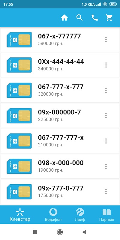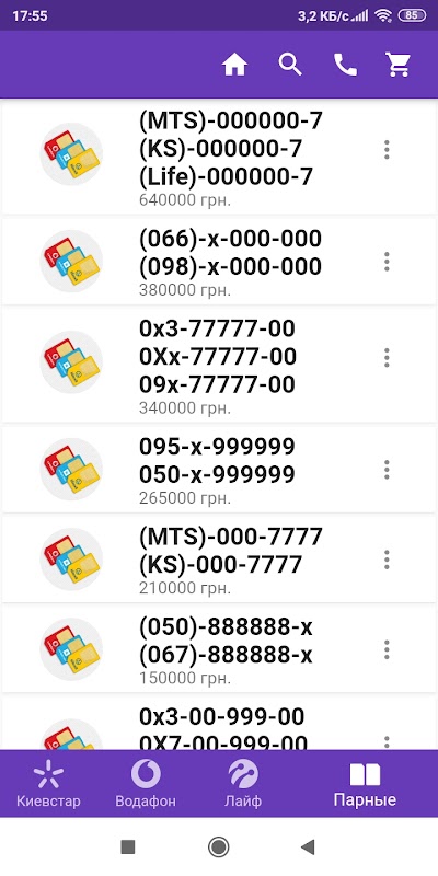این برنامه شامل بیش از 50 هزار شماره تلفن از همه اپراتورهای اصلی در اوکراین - Kievstar ، Vodafone ، Life و همچنین شماره های جفت شده - جفت شماره های یکسان از اپراتورهای مختلف است. با استفاده از برنامه ، می توانید اعداد منحصر به فرد پلاتین ، طلا ، الماس را انتخاب و خریداری کنید. آنها به سرعت از طریق پست الکترونیکی به هر گوشه از اوکراین تحویل داده می شوند و بلافاصله کار برای توسعه موفق تجارت را آغاز می کنند.